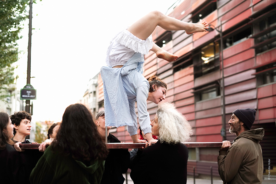 À travers l’acrodanse et le théâtre physique, leur recherche s’ancre dans une relation directe aux gens. Un fort besoin de contact traverse leur travail : créer du lien, se rapprocher des spectateur·ices et imaginer des formes où le public devient partenaire de jeu. Elles cherchent des manières d’engager physiquement les spectateur·ices dans